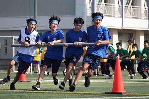 全校生徒が見守る中、2年次代表3名と附属中3年生代表1名が降下し、実際のスリルや難易度等を確認しました。体験した生徒たちは初めての降下訓練でしたが、上手に訓練することができました。
