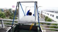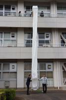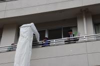 「救助袋」とは、ベランダやバルコニーから布製の袋の中を滑り降り、地上へ避難するもので、斜降式と垂直式がありますが、今回使用したものは垂直式の救助袋です。