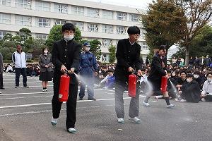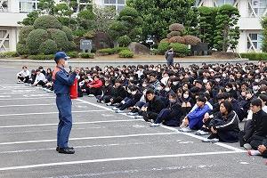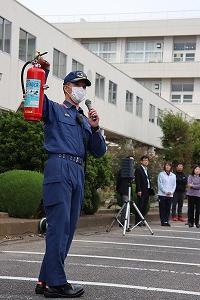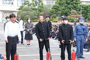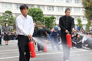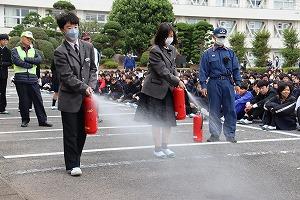 20251029 Following today's escape chute drill (see blog below), members of the Kashima Fire Department gave students a lecture on fire safety, and emergency procedures in case of fires. A number of students participated in the fire extinguisher demonstration that followed. However, they could not put out the traffic cones, which were used in place of real flames, which would have been dangerous in today's strong winds.
