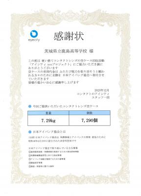 本校では、SDGs活動の一環としてコンタクトレンズの空ケース回収活動「アイシティecoプロジェクト」に参加しています。昨年の12月、これまでの回収分計7.29kg(7,290個)の空ケースをアイシティ鹿嶋チェリオ店まで生徒会役員が届け、アイシティ様を通じてその売却代金を(公財)日本アイバンク協会に寄付することができました。