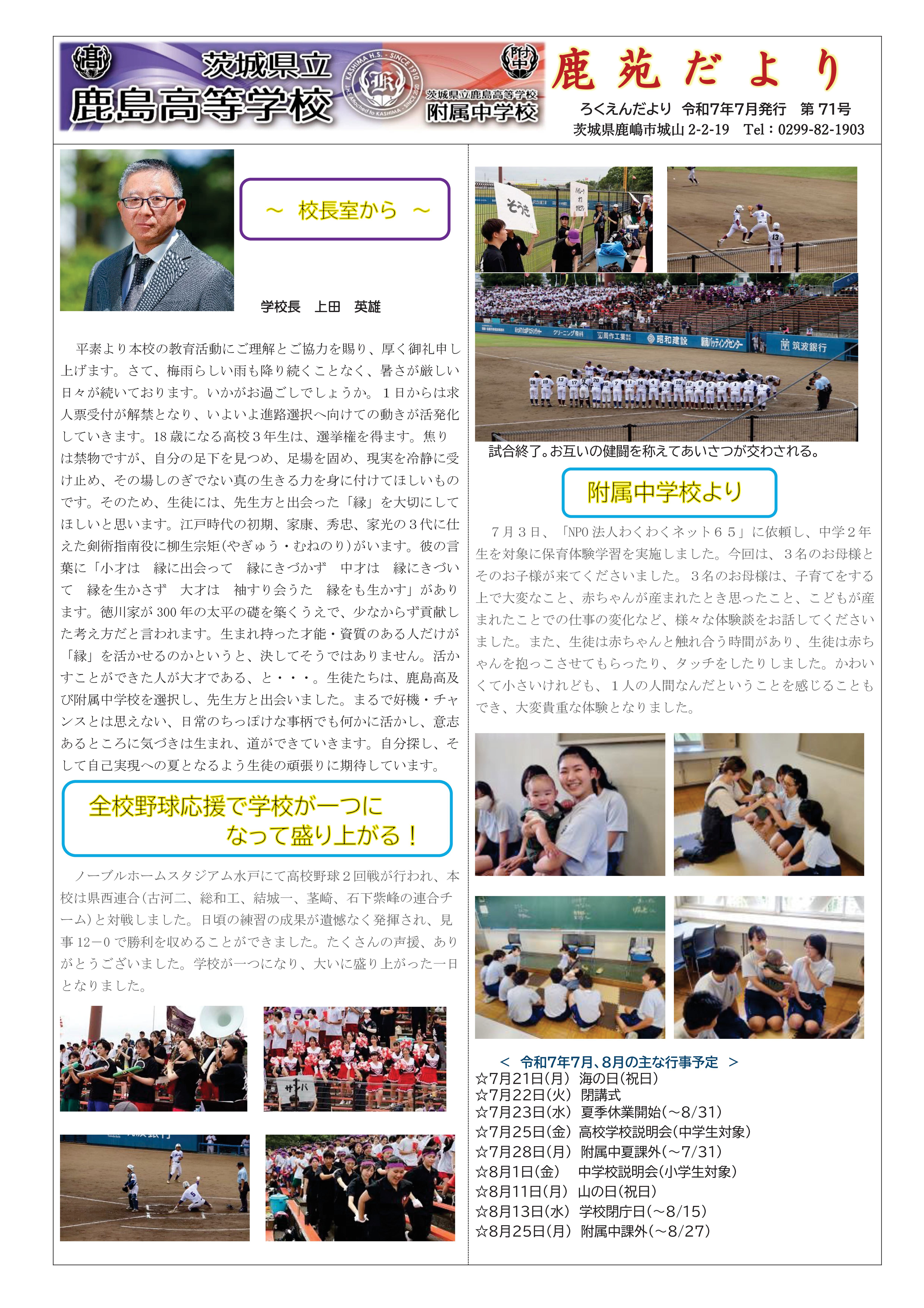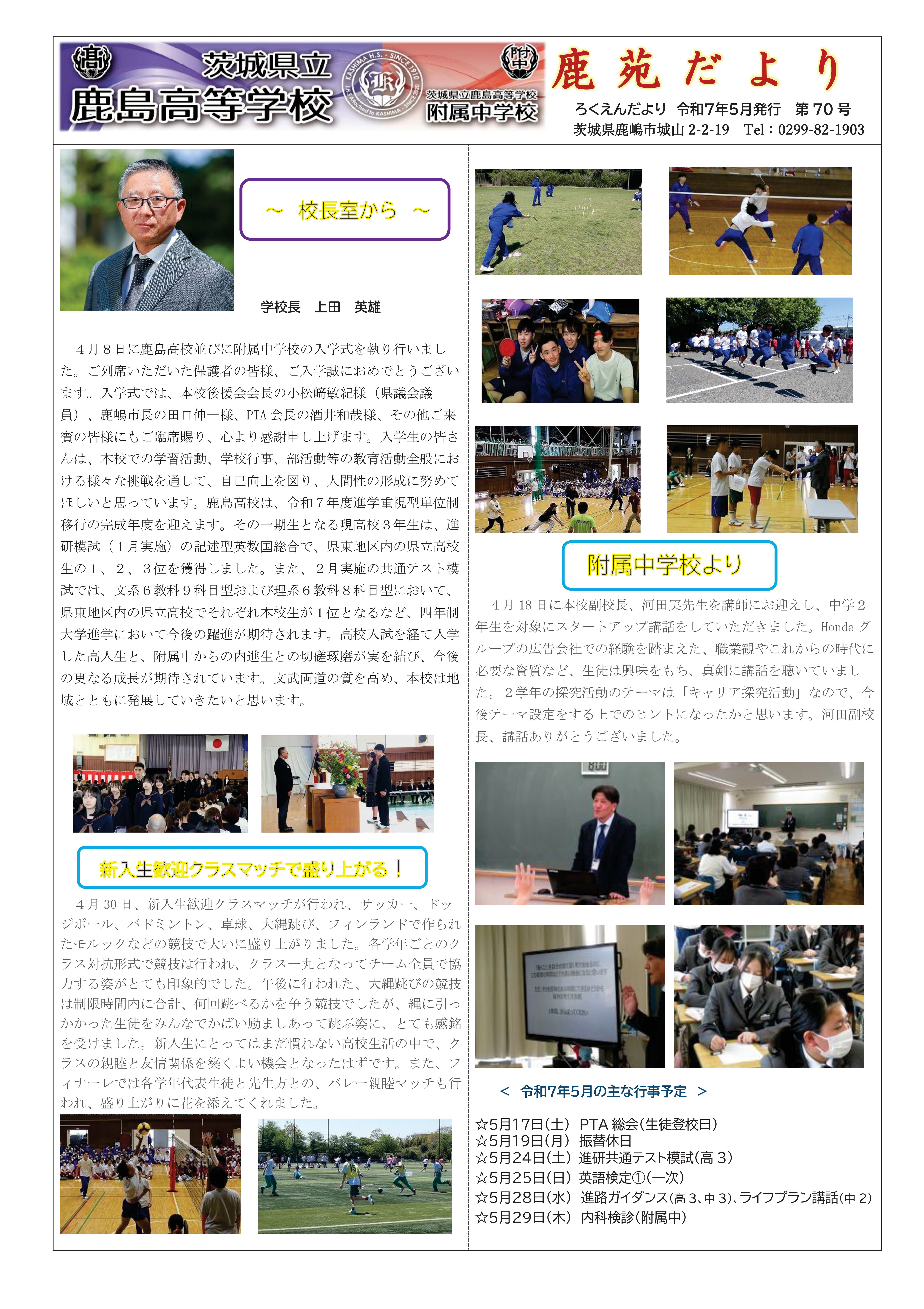 『鹿苑だより』は鹿島高校の広報誌として定期的に発行しており,在校生の出身中学校や地域の皆様にお届けしているものです。